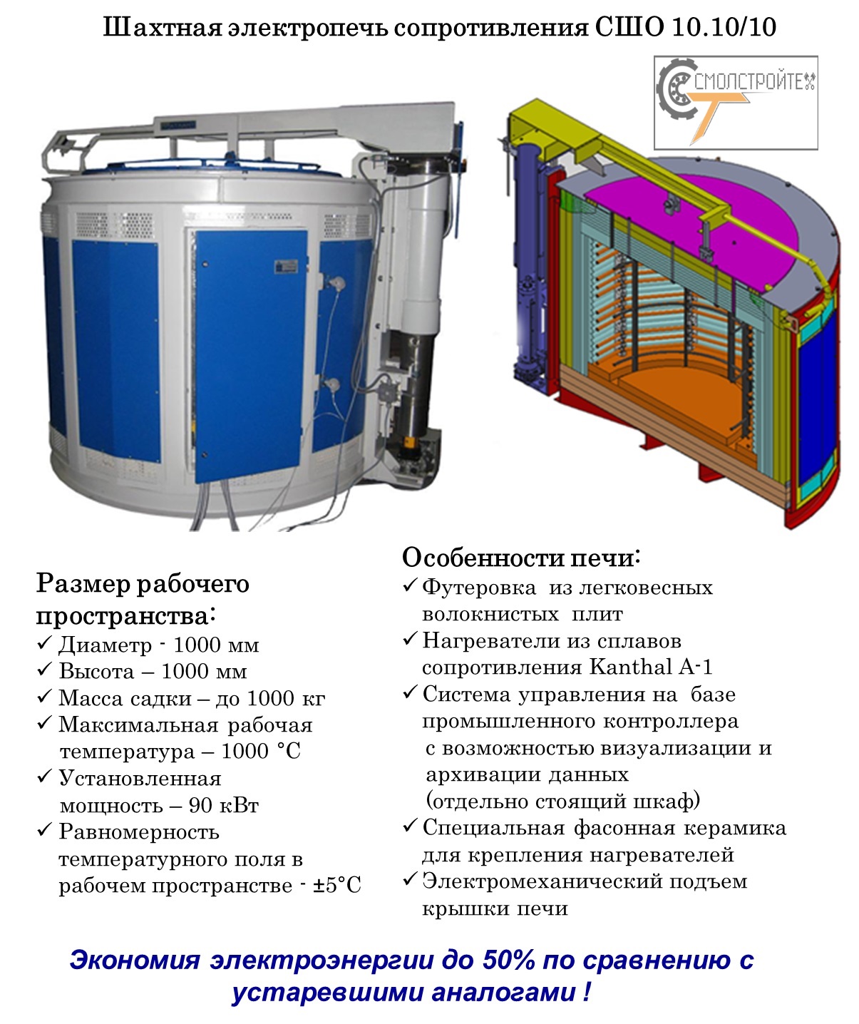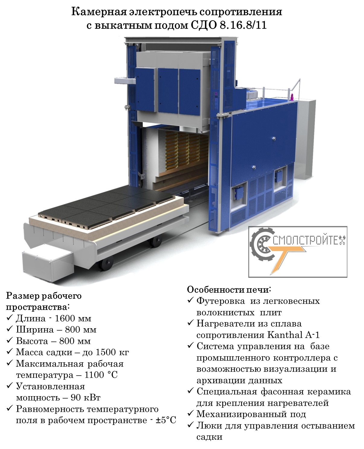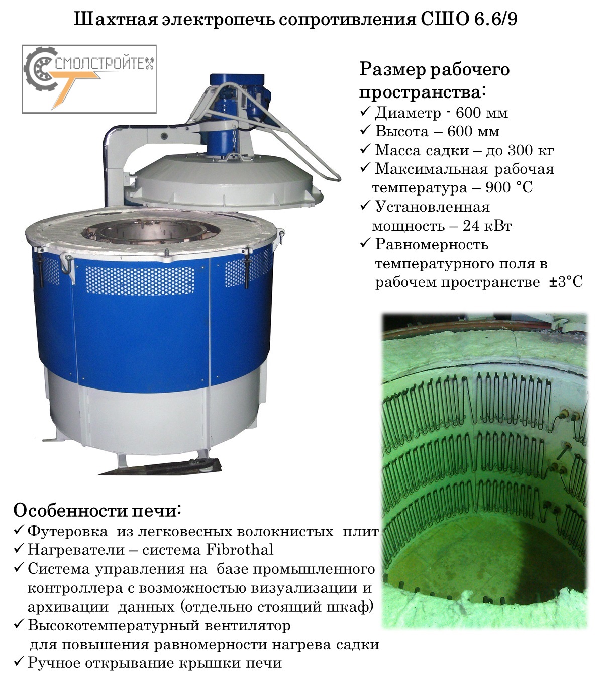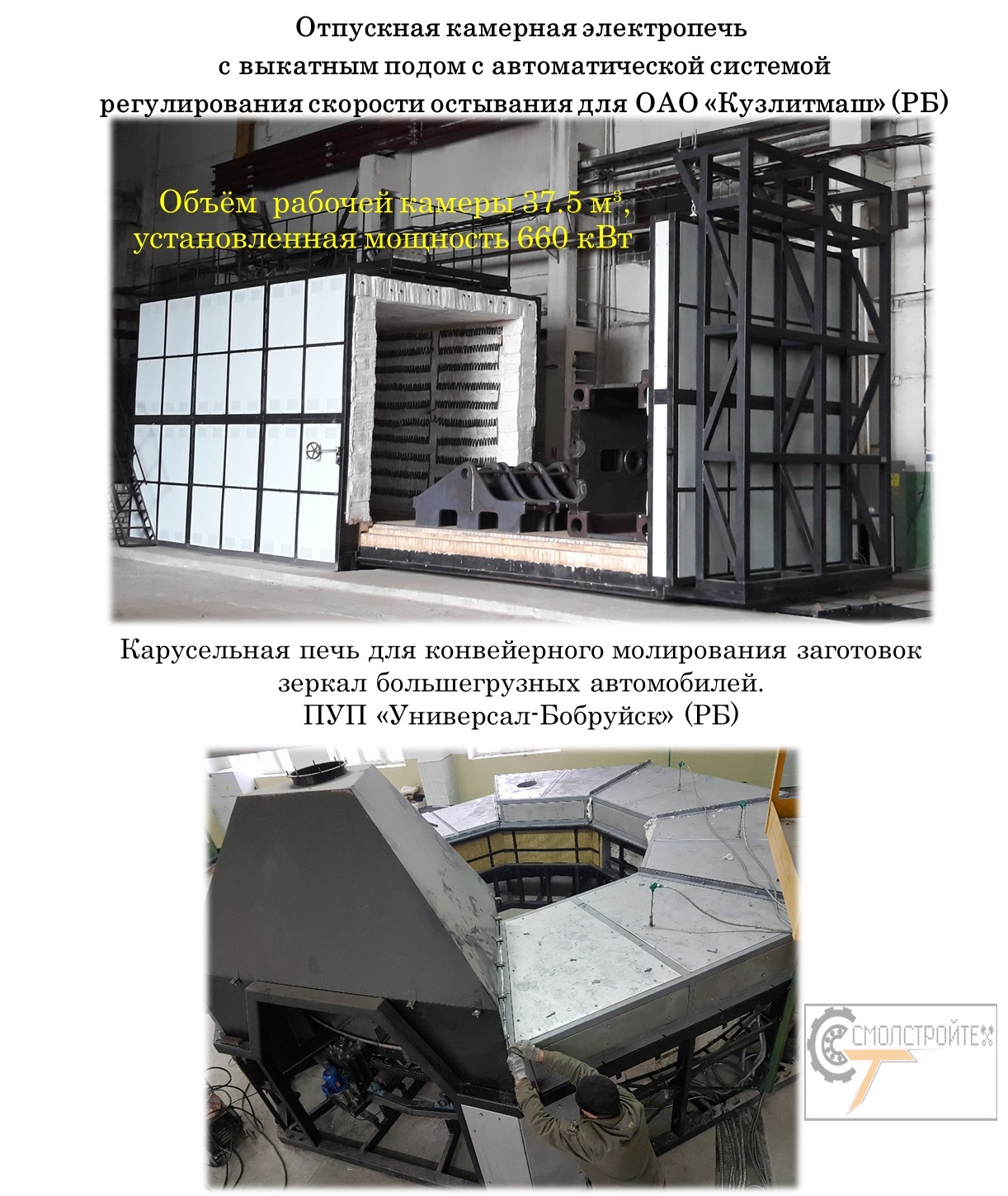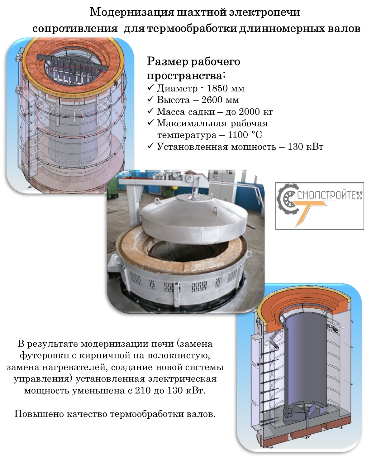 Мы готовы предложить: - Усовершенствование технических процессов с внедрением новейших разработок в области управления, контроля и диспетчеризации термического производства. - Модернизацию устаревшего и (либо) поставку нового термического оборудования следующих модификаций: Шахтные, Колпаковые, Камерные печи, Камерные печи с выкатным подом, а также Конвейерные, Проходные и Кольцевые агрегаты, работающие как в окислительной среде (воздух), так и в защитных средах. Термические агрегаты могут быть изготовлены как отдельные системы, так и собраны в автоматизированные комплексы, укомплектованные закалочными ваннами и системами перемещения заготовок (садки). В ходе работы с нашим предприятием потребитель получает следующие преимущества: 1. Полное импортазамещение. Все термоизоляционные материалы, нагревательные элементы, исполнительные механизмы, комплектующие систем управления и Программное Обеспечение изготовлены или произведены на территории Республика Беларусь, Российская Федерация и Китай. В частности, при Вашей заинтересованности мы готовы разработать и поставить отечественные аналоги систем управления, выполненных из импортных комплектующих типа Siemens, Omron и т.д. с установкой ПО собственной разработки. Организовать согласованный с Вами запас, необходимого для гарантийного сопровождения, комплектующих на нашем складе в г. Смоленск или в любом другом регионе РФ по Вашему запросу, и при достаточном объеме заказов. 2. Предоставление полного гарантийного и пост гарантийного сервисного обслуживания единым сервисным центром, расположенным в г. Смоленск с широким ассортиментом запасных частей и комплектующих. 3. Поэтапный перевод импортного оборудования на запасные части и комплектующие производства РБ и РФ с установкой отечественного программного обеспечения (ПО). А именно: В процессе полной модернизации мы производим 100% замену всех узлов, систем, футеровку и электронику на новые, мы имеем возможность изменения основных параметров модернизируемого оборудования в соответствии с производственной необходимостью и пожеланиями Заказчика, а также гарантируем что по своим характеристикам агрегат после модернизации не будет уступать новейшему оборудованию европейских производителей. После проведения работ Вы получите реальное улучшение в системах: 1. Контроля - не только информирующие о состоянии термических систем, но и способные прогнозировать аварийные ситуации. 2. Управления - «понимающие» глубину прогрева металла садки и самостоятельно принимающие решения о начале выдержки или прекращения термообработки. 3. Термоизоляции – значительно снижающие время разогрева печи и теплопотери, экономя рабочее время и энергоресурсы. 4. Футеровки – со значительным увеличением упругости, прочности сопротивления износу, количества теплосмен, что во много раз увеличивает долговечность и меж сервисные интервалы, значительно снижая эксплуатационные расходы. Многие предлагаемые технические решения уже применены на заводах РБ и РФ, а их эффективность подтверждена опытным путем и зафиксирована документально. Мы объединили разрозненные удачные решения отдельных предприятий России, собственные разработки, а также результаты научно-исследовательской деятельности нашего партнера, «Института тепло-и массообмена имени А.